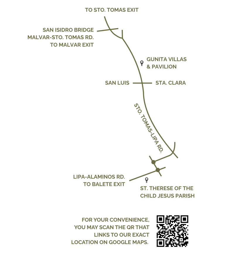 Take Malvar Exit, set your map to San Isidro Bridge Sto. Tomas, then head to Gunita Villas & Pavilion. Avoid this route at night due to construction.